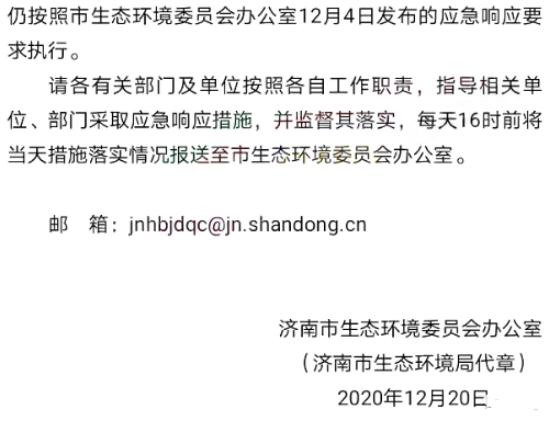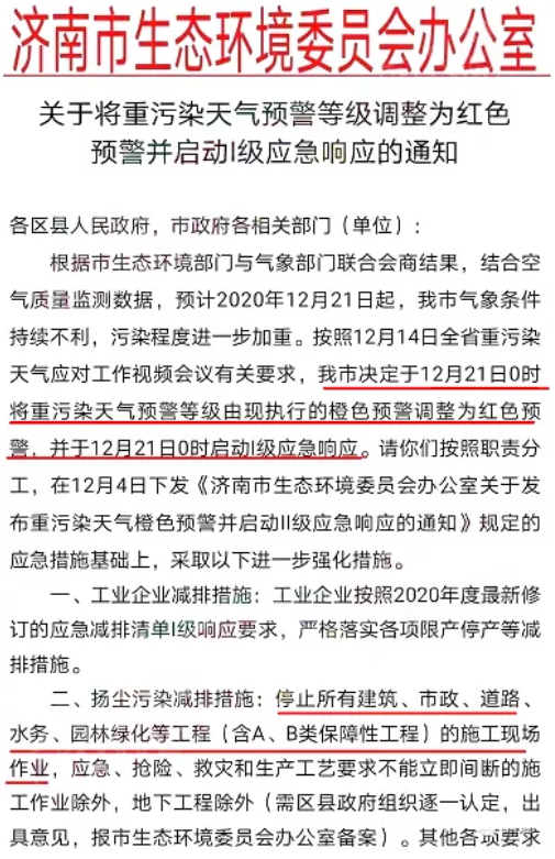 济南市生态环境委员会办公室通知自12月21日0时将重污染天气预警等级由现执行的橙色预警调整为红色预警,并于12月21日0时启动I级应急响应。工业企业按照2020年度最新修订的应急减排清单I级响应要求,严格落实各项限产停产等减排措施。