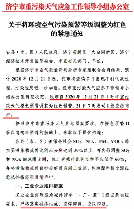 济宁市重污染天气应急工作领导小组办公室发布《关于将环境空气污染预警等级调整为红色的紧急通知》称,自2020年12月21日1时将重污染天气橙色预警调整为红色预警,21日7时启动I级应急响应。