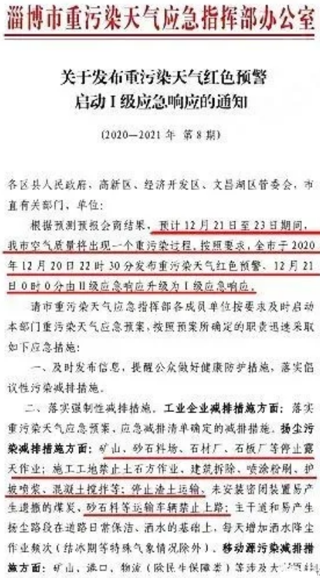 淄博市重污染天气应急指挥部办公室发布《关于发布重污染天气红色预警启动Ⅰ级应急响应的通知》(2020-2021 年 第8 期)称,淄博全市于 2020年12月20日22时30分发布重污染天气红色预警,12月21日0时0分由Ⅱ级应急响应升级为工级应急响应。