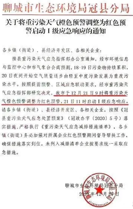 聊城市生态环境局冠县分局发布《关于将重污染天气橙色预警调整为红色预警启动Ⅰ级应急响应的通知》称自12月21日9时将重污染天气橙色预警调整为红色预警,21日11时启动Ⅰ级应急响应。
