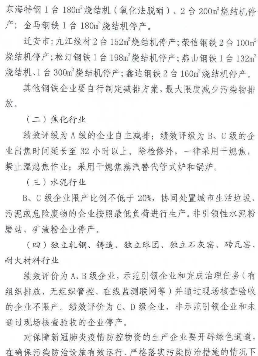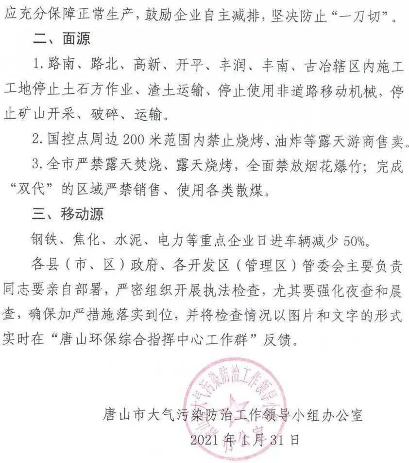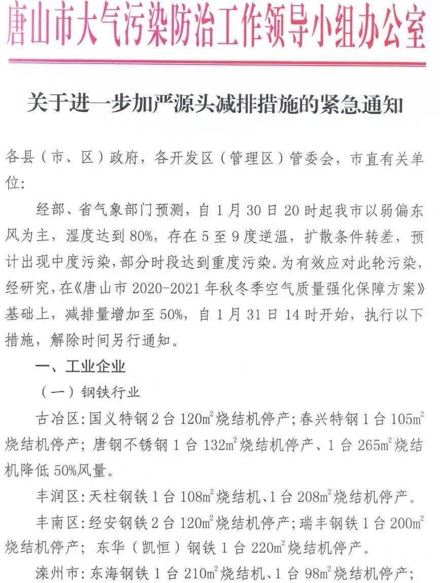 日前,唐山市大气污染防治工作领导小组办公室发布《关于进一步加严源头减排措施的紧急通知》。按照该通知,自1月31日14时开始,唐山 减排量增至50%,烧结机全面停限产。