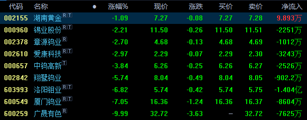 截止本周五收盘,钨上市公司全部下跌,具体为:湖南黄金跌超1%,锡业股份跌超2%,章源钨业、爱康科技跌近3%,中钨高新跌近4%,翔鹭钨业跌近6%,洛阳钼业跌近7%,厦门钨业跌超7%,广晟有色跌近10%。