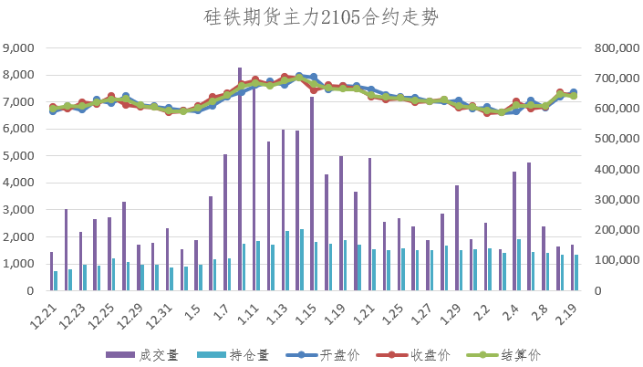 【期货行情】节后硅铁期货盘面较节前走势上扬,本周硅铁期货2105主力合约开盘价7,186,最高价7,410,最低价7,114,收盘价7,224,结算价7,204,成交量299,369,持仓量120,307。