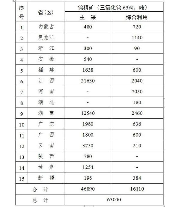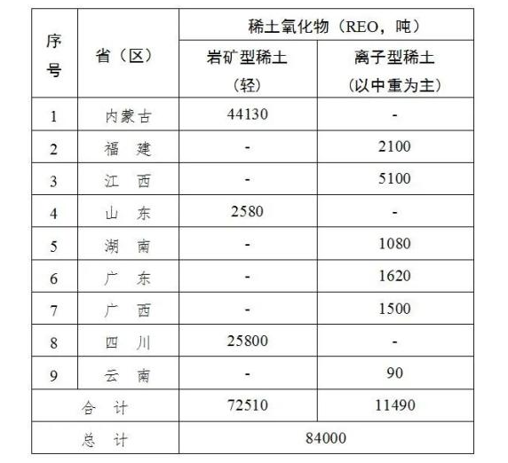 一、2021年度全国第一批稀土矿(稀土氧化物REO,下同)开采总量控制指标84000吨,其中离子型(以中重稀土为主)稀土矿指标11490吨,岩矿型(轻)稀土矿指标72510吨。第一批钨精矿(三氧化钨含量65%,下同)开采总量控制指标63000吨,其中主采指标46890吨,综合利用指标16110吨。分省(自治区)第一批稀土矿、钨矿开采总量控制指标具体分配见附件。