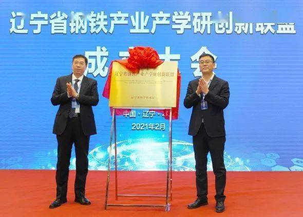 图为辽宁省科技厅副厅长杜秉海,本钢集团党委书记、董事长杨维,为“辽宁省钢铁产业产学研创新联盟”揭牌。