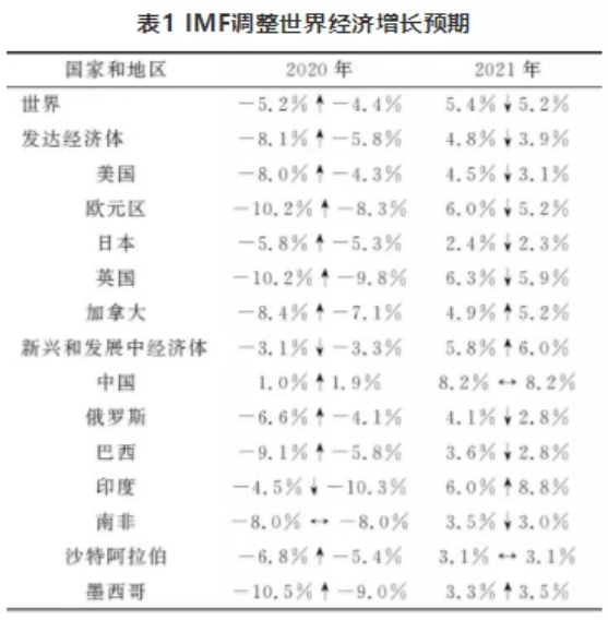 国际货币基金组织(IMF)在2020年10月发布的《世界经济展望》(World Economic Outlook)报告中预测2020年全球经济增速为-4.4%, 较之前预测的-5.2%上调0.8个百分点,2021增速为5.2%,下调0.2个百分点(表1)。
