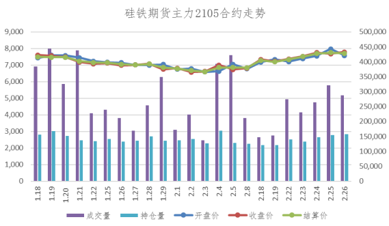 【现货市场】在愈加浓郁的春节氛围下,2月初国内硅铁市场呈小幅偏弱运行态势,厂商方面多数依然排单生产,现货尤其加工块紧张,但下游成交有所减弱,叠加部分物流运输陆续暂停,不乏有企业小幅调整报价。但内蒙一则电价调整通知,带动4日硅铁期货盘面涨停,业内不乏观望情绪。节后复市,期货盘面较节前总体上扬,市场采购逐渐活跃,厂商方面虽然由于春节假期及运输等原因出现累库,但压力不大且去库速度较明显,硅铁现货市场整体情绪仍较良好,叠加2月下旬内蒙地区高能耗限制类企业名单(第一批)流出,甘肃发改委等7部门联合发布铁合金等八个高耗能行业调整执行差别电价管理办法,工厂排单预售情况较好,加工块尤其75#加工块趋紧,硅铁市场总体乐观观望、看涨情绪渐浓。
