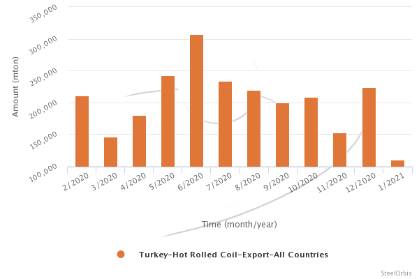 根据土耳其统计研究所(TUIK)提供的数据,今年1月,土耳其热轧卷材(HRC)出口总额与去年12月相比下降50.9%,至109640吨,同比下降59.1%。这些出口价值为600.02万美元,环比下降50.0%,与2020年同月相比下降48.6%。