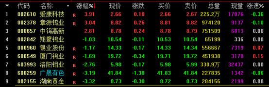 今日,钨上市公司开盘表现涨跌不一,下午收盘爱康科技涨幅近4%,章源钨业涨超3%。中钨高新涨超2%,湖南黄金跌超近3.5%,广晟有色跌超3%,洛阳钼业跌近3%。