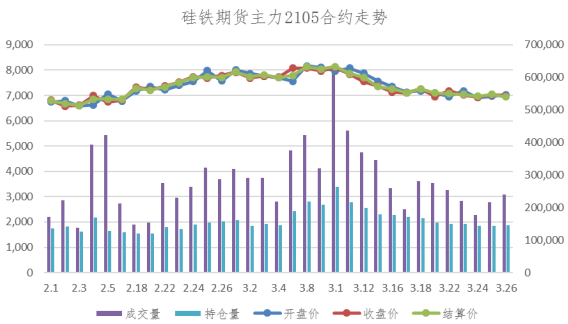 【期货行情】本周硅铁期货盘面小幅盘整,2105主力合约开盘价6956,最高价7218,最低价6802,收盘价6978,结算价6948,成交量1108776,持仓量144672,涨幅-1.64%。