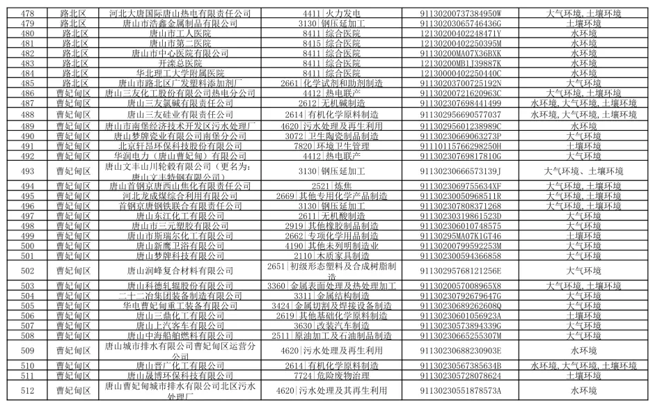 | 181 | 古冶区 | 唐山国义特种钢铁有限公司 | 3130|钢压延加工 | 91130204779170408Q | 大气环境,土壤环境 |