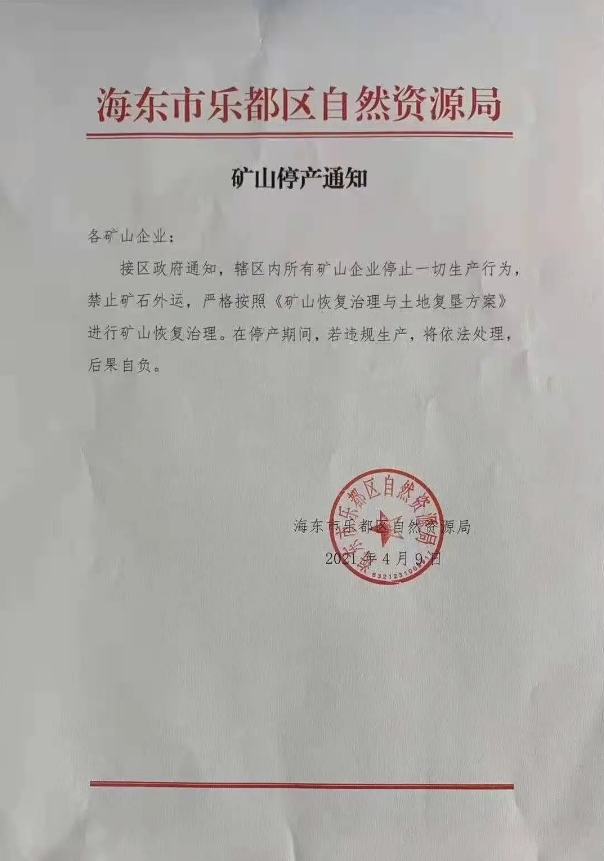 中国铁合金网讯:海东市乐都区自然资源局发布矿山停产通知,要求辖区内所有矿山停止一切生产行为,禁止矿石外运,进行矿山恢复治理。