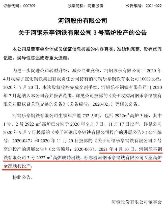 2021年4月10日,河钢乐亭钢铁有限公司3号2922m3高炉成功出铁,标志着河钢乐亭钢铁有限公司3座高炉全部顺利投产。