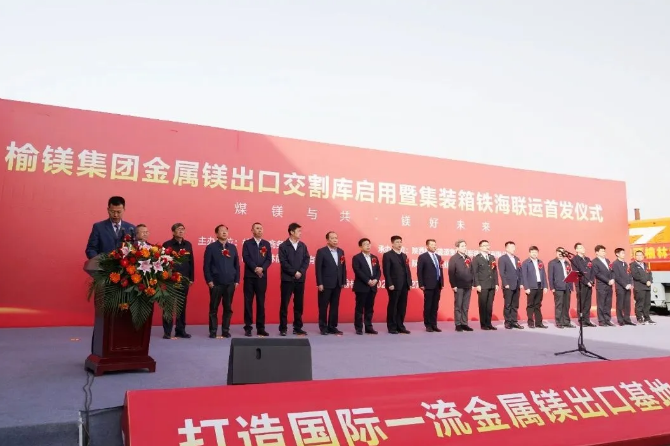 4月27日,榆镁集团金属镁出口交割库启用暨集装箱铁海联运首发仪式在榆林象道物流园举行。副市长王华胜出席仪式并下达发车令,市商务局局长崔渊讲话。中国有色金属工业协会镁业分会会长林如海,集团公司党委副书记、总经理段智博分别致词。煤炭进出口公司党委副书记、总经理,榆镁集团董事长王飞介绍公司发展运营情况。仪式由市政府办四级调研员王强主持。