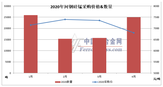 4月河钢硅锰6517招标定价6800元/吨,较询盘价持平,较3月↓550元/吨,共25000吨,环比3月增9270吨。