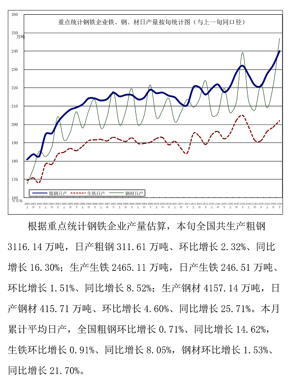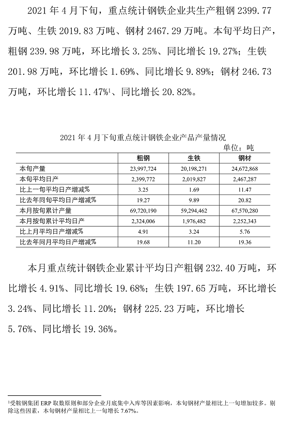 中国铁合金网讯:据中钢协数据,2021年4月下旬,重点统计钢铁企业粗钢日均产量239.98万吨,连续三旬上涨,再创历史新高;环比增加7.56万吨,增幅3.25%,同比增长19.27%。