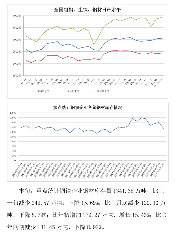 截至4月下旬末,重点企业钢材库存量1341.38万吨,较上一旬减少249.57万吨,下降15.69%。