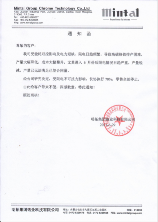 中国铁合金网讯:明拓集团铬业科技有限公司零售终止
