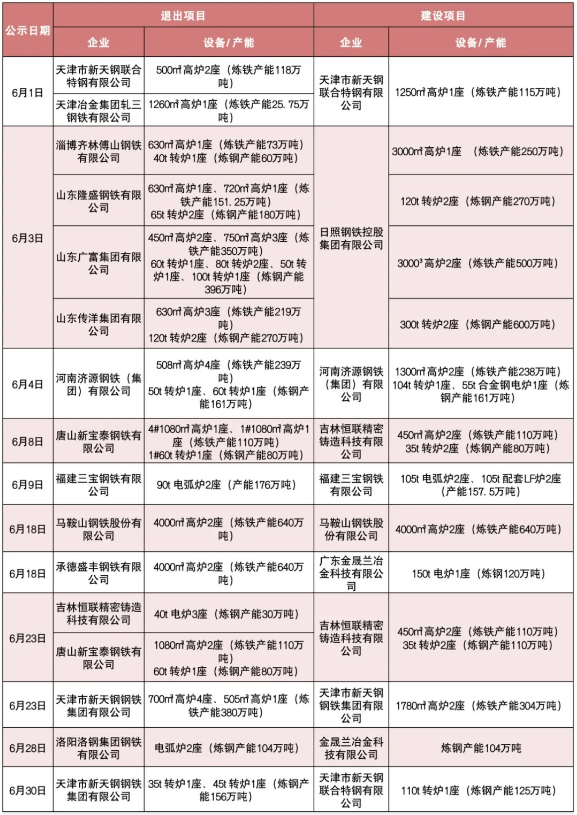 中国铁合金网讯:2021年6月1日,新版《钢铁行业产能置换实施办法》(简称《办法》)正式施行。新版《办法》修订后,将促进钢铁行业加快适应为满足碳达峰目标而实施绿色低碳发展的迫切要求,推动行业转型升级高质量发展。据不完全统计,6月份以来,有11个钢铁产能置换项目公示发布,具体如下图: