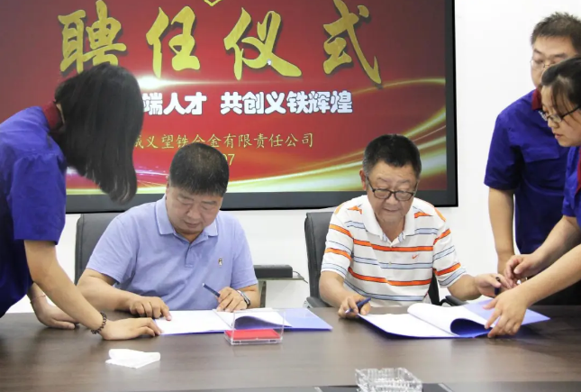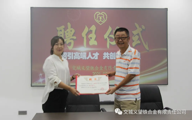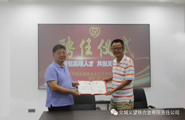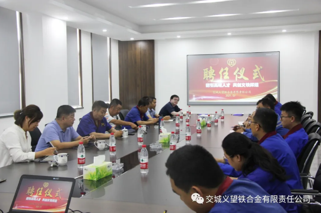 中国铁合金网讯:2021年7月9日下午,“招引高端人才 共创义铁辉煌”聘任仪式在矿渣棉厂办公楼会议室隆重举行,聘请北京科技大学王海娟博士、太原理工大学高峰博士为公司长期技术顾问。公司董事长宋晋乐、总经理康国柱及各副总经理、铁合金厂与矿渣棉厂厂长、副厂长及相关技术人员出席了本次聘任仪式。