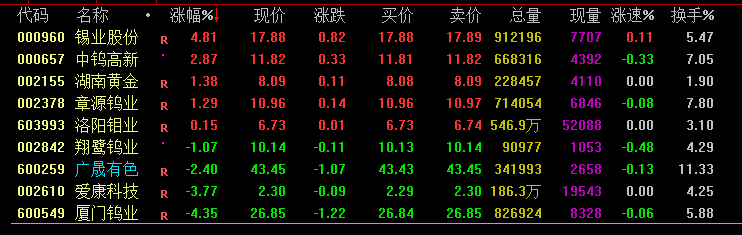 今日,钨上市公司开盘涨跌不一,截止下午收盘股价表现锡业股份领涨,涨幅4.81%,广晟有色跌幅2.40%,厦门钨业领跌,跌幅4.35%,中钨高新涨幅2.87%,洛阳钼业涨幅0.15%,湖南黄金涨幅1.38%,翔鹭钨业跌幅1.07%,章源钨业涨幅1.29%,爱康科技跌幅3.77%。