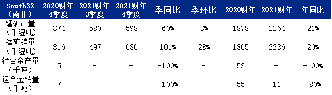 在2021财半年度里,South32并没有生产任何锰合金,究其原因是其从原先的TEMCO合金厂撤资。