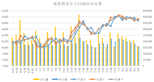 本周硅铁期货盘面高位波动,2109主力合约周开盘价8,900,最高价9,076,最低价8,804,收盘价8,934,结算价8,898,成交量1,054,057,持仓量159,574,涨幅-1.04%。