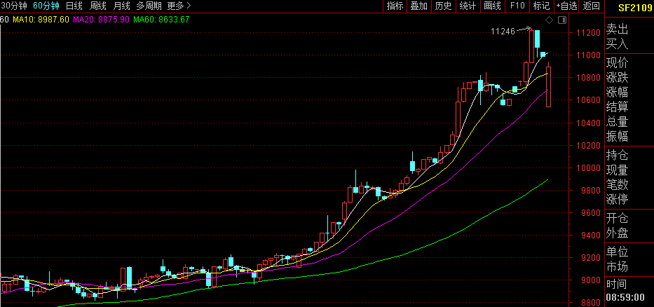 【期货盘面】8月硅铁期货盘面强势上行,2109合约月开盘价8,900,最高价10,850,最低价8,804,收盘价10,700,结算价10,708,成交量2,670,550,持仓量7,324,涨幅18.52%;2201合约月开盘价8,702,最高价10,624,最低价8,662,收盘价10,500,结算价10,468,成交量5,464,035,持仓量280,410,涨幅18.86%。