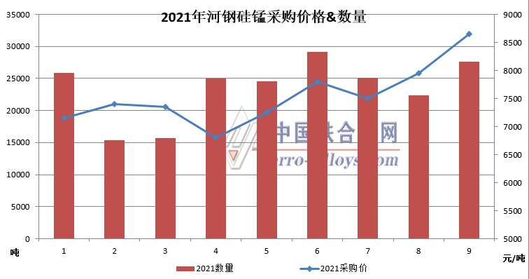 河钢集团9月硅锰招标价格出台:8650元/吨(8月定价7950元/吨),2020年9月定价6330元/吨。硅锰采购量27566吨,环比8月增加5216吨(2020年9月采购量24600吨)。