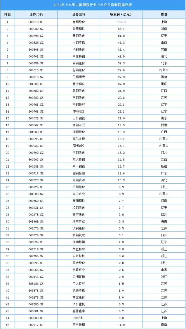 其中,2021年上半年AB股钢铁行业上市公司净利润居第一的是宝钢股份,净利润达150.8亿元;华菱钢铁净利润居第二,净利润为55.7亿元;鞍钢股份净利润居第三,净利润为51.8亿元。