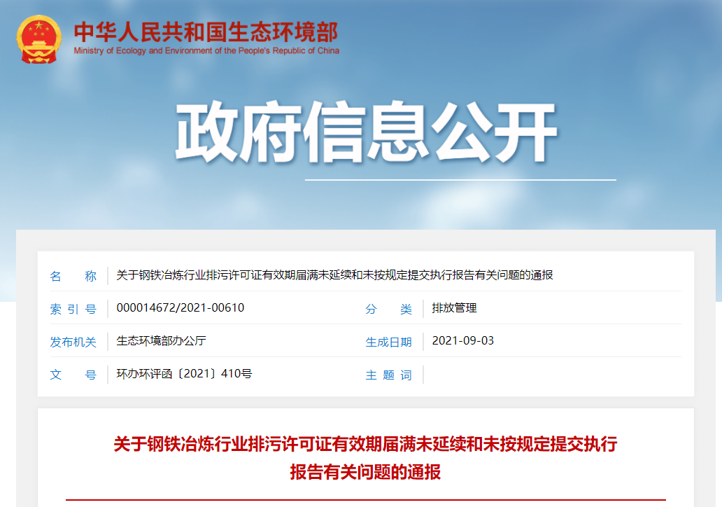 关于钢铁冶炼行业排污许可证有效期届满未延续和未按规定提交执行报告有关问题的通报