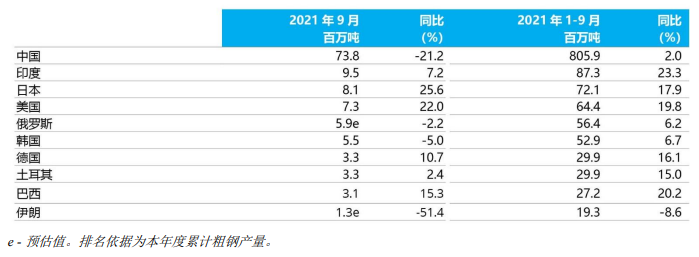 中国粗钢产量为7380万吨,同比下降21.2%;印度粗钢产量为950万吨,同比提高7.2%;日本粗钢产量为810万吨,同比提高25.6%;美国粗钢产量为730万吨,同比提高22%;俄罗斯粗钢预估产量为590万吨,同比下降2.2%;韩国粗钢产量为550万吨,同比下降5.0%;德国粗钢产量为330万吨,同比提高10.7%;土耳其粗钢产量为330万吨,同比提高2.4%;巴西粗钢产量为310万吨,同比提高15.%;伊朗粗钢预估产量为250万吨,同比提高8.7%。