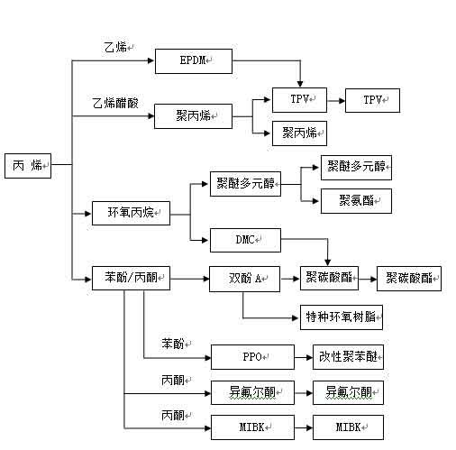 丙烯下游规划聚丙烯项目,并以聚丙烯、乙丙橡胶为原料生产市场前景好、附加值高的聚烯烃热塑性弹性体项目。另外,与外购苯资源结合,发展苯酚/丙酮项目。环氧丙烷是重要的有机化工原料,下游衍生精细化工产品丰富,其中碳酸二甲酯是非光气法聚碳酸酯的另一种主要原料。规划发展清洁工艺路线的过氧化氢环氧丙烷,下游延伸聚醚多元醇、碳酸二甲酯、聚氨酯项目。