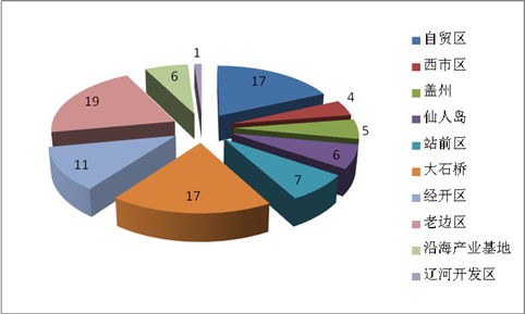 由上图可见,营口市石化产业布局相对分散。全市区域范围内的四个行政区(鲅鱼圈区、站前区、西市区、老边区)、一个新区(沿海新区)及两市(县)(大石桥市、盖州市)均分布着规模不同的各类石化企业。