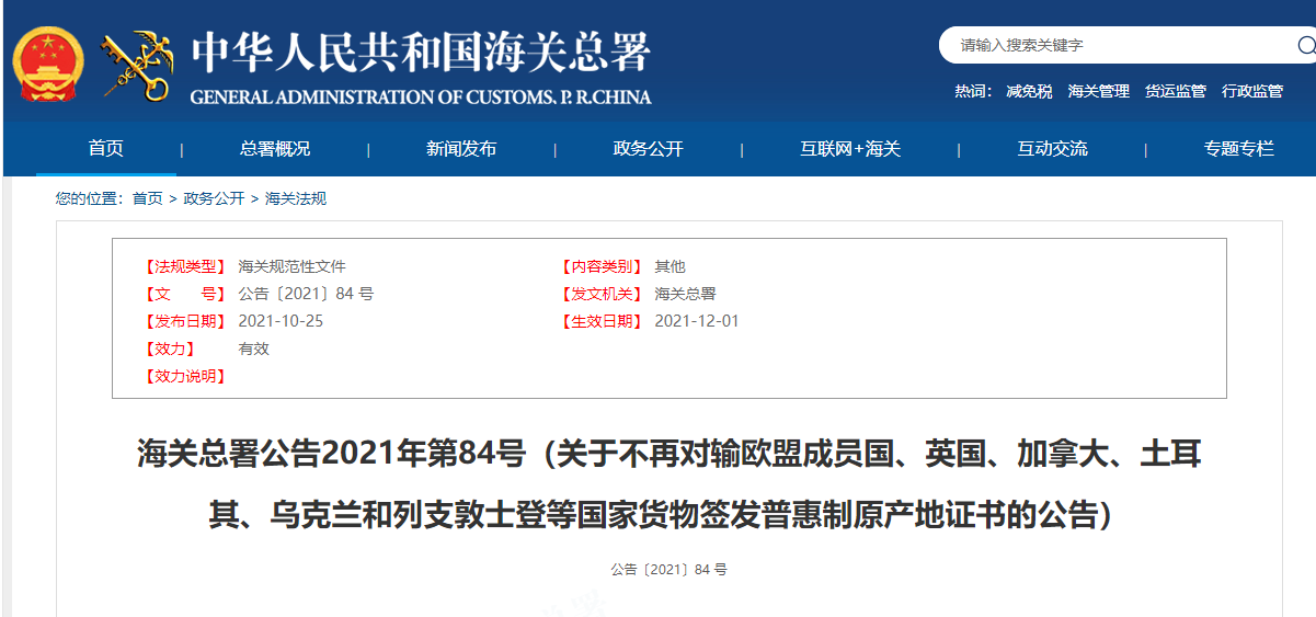 中国铁合金网:海关总署公告2021年第84号(关于不再对输欧盟成员国、英国、加拿大、土耳其、乌克兰和列支敦士登等国家货物签发普惠制原产地证书的公告)