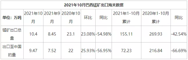 2021年1-10月巴西锰矿出口量累计155.11万吨,同比下降42.54%;其中出口至中国72.23万吨,同比下降66.69%。
