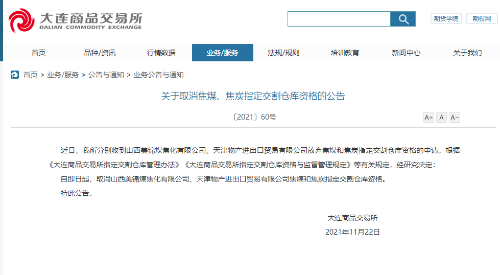 自即日起,取消山西美锦煤焦化有限公司、天津物产进出口贸易有限公司焦煤和焦炭指定交割仓库资格。