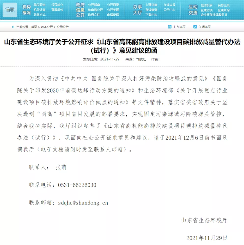 11月29日,山东省生态环境厅组织起草了《山东省高耗能高排放建设项目碳排放减量替代办法(试行)》。