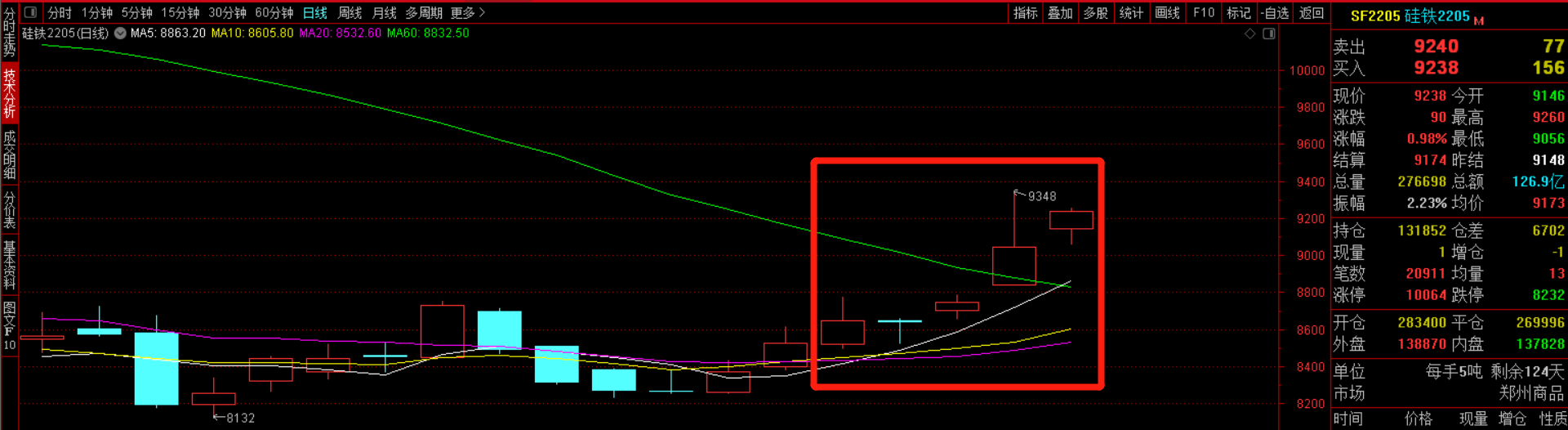 【期货盘面】本周硅铁期货2205主力合约先降后升,周开盘价8,520,最高价9,348,最低价8,492,收盘价9,238,结算价9,174,成交量1,338,661,持仓量131,852,涨幅8.84%。