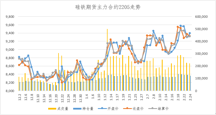 2月硅铁现货市场在库存不多、不少厂家已开始排单生产、钢招价格逐步走高(湖南某钢厂2月硅铁75-B招标价定在9350元/吨)等利好因素下稳健运行,报价探涨,低价货源难寻,2月第4周72#加工块报价多在8700-8900元/吨左右;在利润尚可的情况下,供给端也在逐渐恢复(1月国内硅铁产量再度超过50万吨),14日宁夏中卫众泰工贸复产一台33000KVA矿热炉,据悉日产100吨左右,预计3月份主产区还将有新的投产(主要集中在内蒙以外产区)。3月钢招在即,新一轮需求集中释放下,短期内硅铁市场仍多将维稳运行。