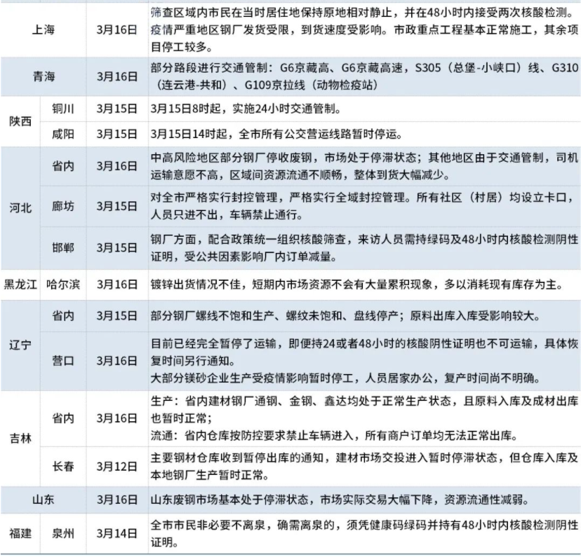 多地钢厂出现车辆资源紧张导致发货需等待较长时间、部分地区禁止外省车辆进入等情况。其中,部分疫情严重地级市无法正常配送及发货,如广东受疫情影响,主要钢厂暂停配送影响比例在三成左右。15省份的具体情况如下: