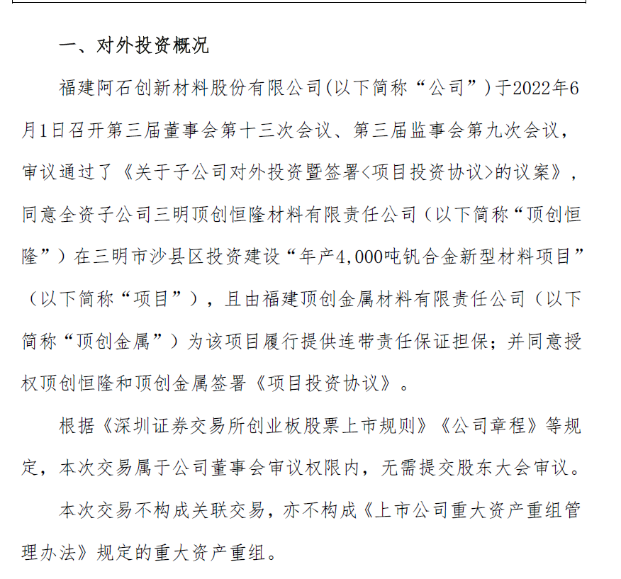 中国铁合金网:6月2日,阿石创发布公告称,公司子公司顶创恒隆拟与三明高新技术产业开发区管理委员会、三明市沙县区金兴园建设开发有限公司、福建顶创金属材料有限责任公司签署《项目投资协议》,计划在三明市沙县区投资建设年产4000吨钒合金新型材料项目,投资金额为2.5亿元。