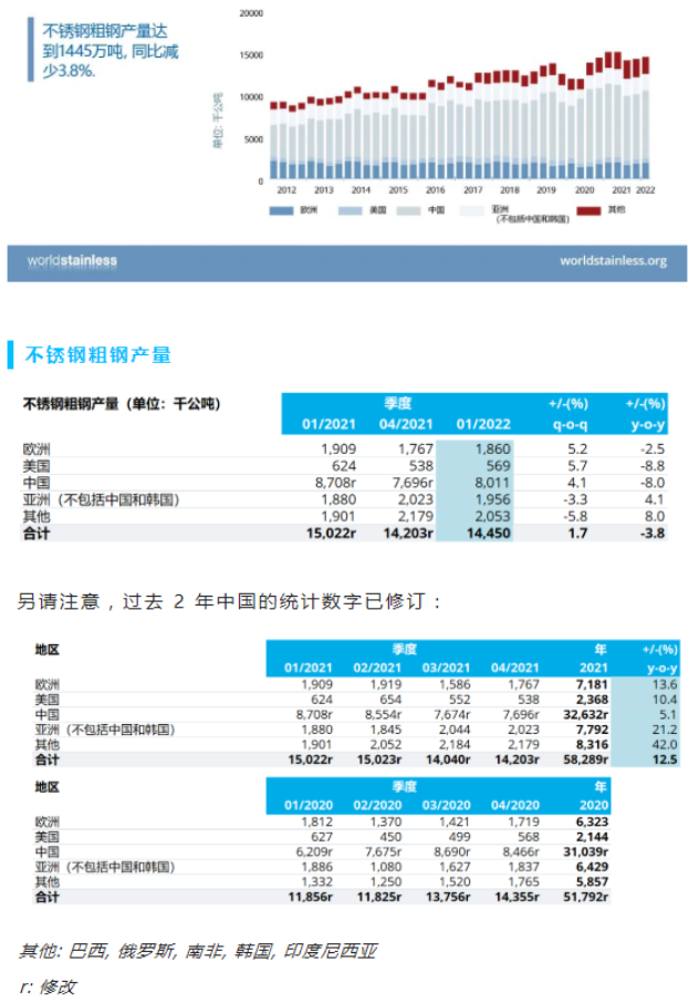 [导读]2022年第一季度全球不锈钢粗钢产量达到1445万吨,同比减少3.8%。