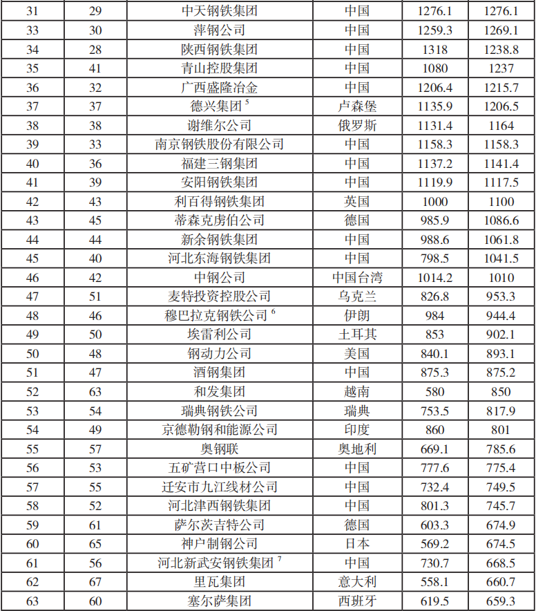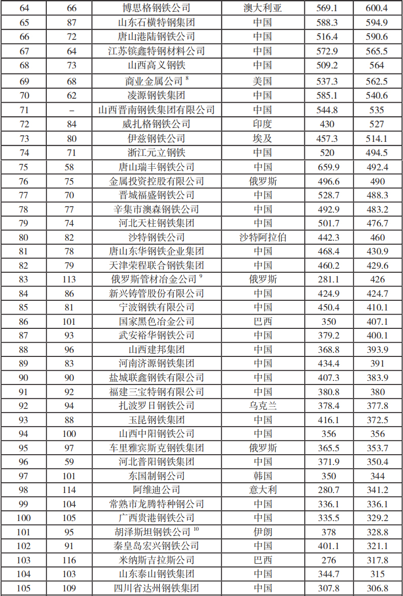韩国三家钢铁企业上榜,其中浦项2021年粗钢产量同比增长5.9%至4300万吨,而现代钢铁和东国制钢粗钢产量均同比下滑。浦项粗钢产量排名由上年的第五位后退至第六位,现代钢铁也由上年的第17名降至第19名。