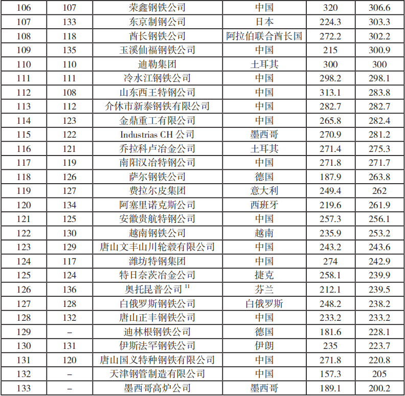 英国行业研究机构《金属通报》(Metal Bulletin)近日公布2021年全球钢铁企业粗钢产量排名。今年的排行榜上全球共有133家钢铁企业粗钢产量超过200万吨,比去年少四家,其中中国企业为72家,数量占排名企业的54.1%;榜单新增企业四家,其中有两家中国钢铁企业,分别为山西晋南钢铁集团有限公司和天津钢管制造有限公司。
