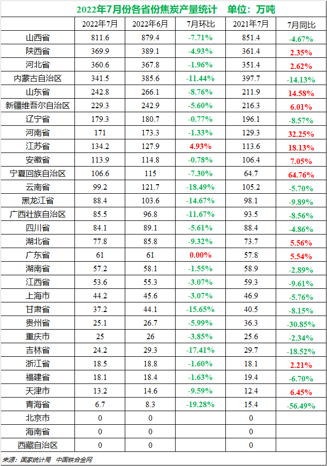7月份我国各省份焦炭产量统计明细