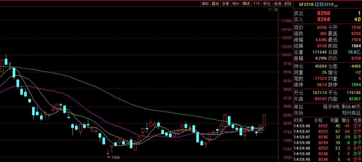 本周硅铁期货2210主力合约开盘价7,806,最高价8,266,最低价7,622,收盘价8,250,结算价8,158,成交量680,123,持仓量45,604,涨幅7.48%。