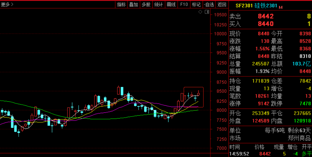 本周硅铁市场总体以维稳运行为主,期货盘面继上周攀升后震荡盘整,2301主力合约开盘价8,376,最高价8,528,最低价8,226,收盘价8,440,结算价8,448,成交量997,444,持仓量171,839,涨幅1.22%;需求端,北方代表性钢厂11月72#硅铁招标价敲定8650元/吨,环比下降200元/吨,采购量1049吨,较10月减少1101吨,谨慎观望情绪较浓;成本端,神木市兰炭集团8日发布通知:近期兰炭企业原料块煤采购持续紧张并价格高涨,导致兰炭生产企业严重亏损,为稳定生产,尽量保障上下游产业链健康发展,研究决定从11月9日零时起,兰炭销售执行中料1850元/吨,小料1800元/吨指导价(出厂含税价),对硅铁行情形成一定支撑;供应端,据悉青海宁夏等地均有企业避峰生产或减产,整体产量有相对较为明显的下降。综上,硅铁企业考虑成本支撑,低价出售意愿低,但下游需求依然相对低位,尤其金属镁市场表现不足,75#硅铁报价有100元/吨左右的小幅下降,72#硅铁报价暂时变化不大。关注供需两端变化及期货盘面走势等。
