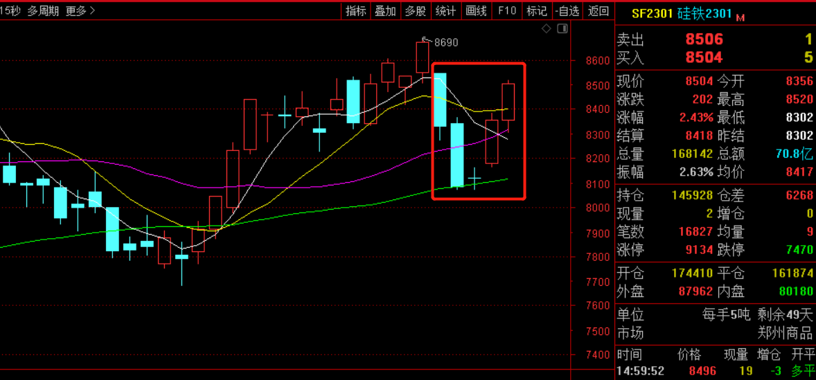 本周硅铁期货盘面先跌后涨,2301主力合约开盘价8,546,最高价8,546,最低价8,070,收盘价8,504,结算价8,418,成交量1,127,212,持仓量145,928,跌幅1.25%。