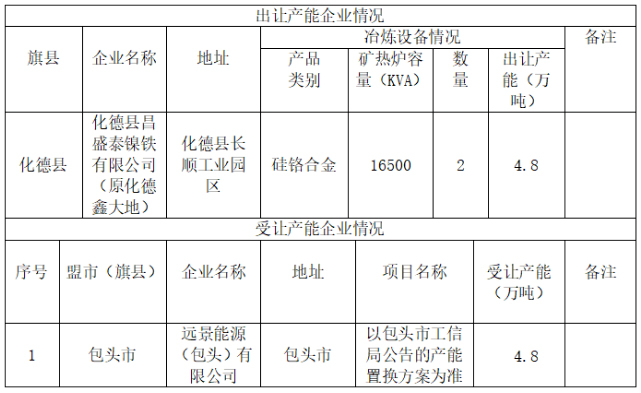 按照内蒙古自治区发展改革委工信厅能源局《关于确保完成“十四五”能耗双控目标任务若干保障措施的通知》(内发改环资字〔2021〕209号)、内蒙古自治区发展改革委 工信厅 能源局关于修订《确保完成“十四五”能耗双控目标任务若干保障措施的通知》(内发改环资字〔2022〕1128号)、内蒙古自治区发展改革委生态环境厅关于印发《内蒙古自治区坚决遏制“两高”项目低水平盲目发展管控目录》的通知(内发改环资字〔2022〕1127号)和乌兰察布市工信局关于印发《乌兰察布市铁合金行业产能置换实施方案(试行)的通知》(乌工信发〔2022〕59号)的相关要求,乌兰察布市工信局将化德县昌盛泰镍铁有限公司(原化德鑫大地)硅铬合金矿热炉项目产能置换方案进行了公示,公示期间无异议,现予公告。欢迎社会公众进行监督。